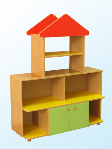 изготовлена из ЛДСП, торцы облицованы кромкой ПВХ 2 мм. Состоит из двух секций: нижняя секция имеет 2 двери и 4 открытых ячейки, верхняя секция имеет 2 открытые полки и пикообразную надстройку. Стенка снабжена ножками-опорами регулируемыми по высоте, на дверях установлены ручки-кнопки