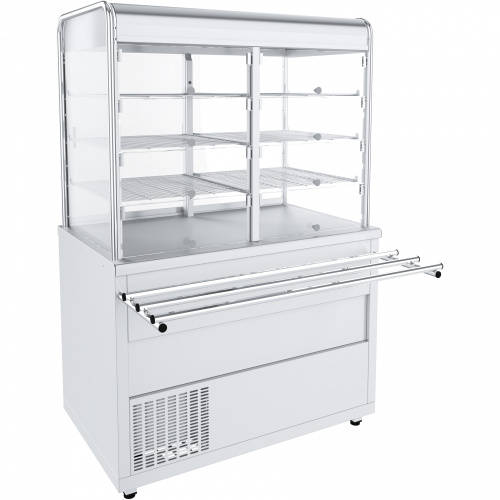 Стол охлаждаемый с витриной СОЭП-В/ЛП Лира-Профи предназначен для кратковременного хранения, демонстрации и раздачи потребителю холодных закусок, салатов, охлажденных напитков, кисломолочных продуктов и других блюд, требующих хранения в охлажденном состоянии. Закрытая демонстрационная витрина имеет площадь охлаждаемой столешницы: 0,64 м², перфорированных полкок: 1,56м², полезный объем витрины 0,5 м³. Плавная регулировка температуры 10...15°С. Контроллер. Номер хладагента: R22. Внутри витрины находится светодиодная подсветка и воздухоохладитель. Со стороны потребителя имеются поднимающиеся стеклянные дверки, со стороны персонала установлены раздвижные стеклянные дверки. Внизу - открытый нейтральный отсек для хранения и размещения кухонного инвентаря. Оснащается поддоном для сбора воды, регулируемыми по высоте ножками и направляющими для подносов. Поставляется в собранном виде на поддоне. Упаковка гофрокартон и деревянная обрешетка.
