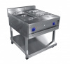 Две ванны для воды. Терморегулятор позволяет поддерживать температуру воды от +30 С до +85 С. Гастроемкости с горячей опцией устанавливаются в гнездо ванны. Слив воды осуществляется с помощью сливного крана. Подставка из нержавеющей стали.