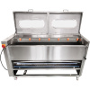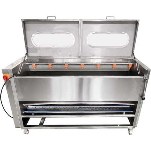 Сырые овощи загружаются в бункер на вращающиеся валы. Сверху подается вода. Вращающиеся валы осуществляют перемешивание и мойку овощей, вода смывает ростки, землю. Выгрузка овощей осуществляется посредством вращения валов, автоматически выбрасывая на отводящий лоток. Оборудование состоит из щеточных валов, оснащено форсунками подачи воды.