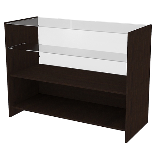 Материал: ламинированный ДСП 16 мм, кромка ПВХ 0,4 мм и 2 мм, стекло - перед 4 мм, полки и верх 5 мм. Витрина имеет два назначения. Она одновременно и прилавок, на котором можно выдавать товар, и витрина, в которой можно выложить весь ассортимент продукции. Имеет увеличенную демонстрационную часть. Плюс большой в том, что товар находится в выгодном месте, не заметить его невозможно. Две полки хорошо подойдут для товара среднего размера.