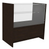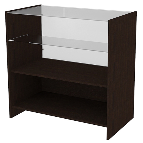 Материал: ламинированный ДСП 16 мм, кромка ПВХ 0,4 мм и 2 мм, стекло - перед 4 мм, полки и верх 5 мм. Витрина имеет два назначения. Она одновременно и прилавок, на котором можно выдавать товар, и витрина, в которой можно выложить весь ассортимент продукции. Имеет увеличенную демонстрационную часть. Плюс большой в том, что товар находится в выгодном месте, не заметить его невозможно. Две полки хорошо подойдут для товара среднего размера.