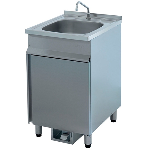 Ванна цельнотянутая с бортиком, выполнена из нержавеющей стали марки AISI 304 толщиной 0,8 мм и имеет разборный каркас. Внутренний размер ванны – 390х420х150 мм. Боковые стенки и передняя распашная дверца выполнены из нерж. стали. Задняя стенка выполнена из оцинк. стали толщиной 1,2 мм и имеет два отверстия для подводки воды. Ванна имеет педаль, при нажатии на которую из крана поступает вода. Опорные ножки выполнены из нержав. трубы диаметром 50 мм, регулируются по высоте. Ванна укомплектована сливным сифоном с гидрозатвором