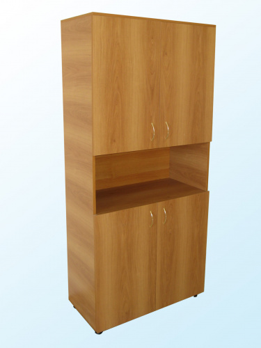 изготовлен из ЛДСП, торцы облицованы кромкой ПВХ 0,4 мм. Вверху и внизу по две ниши закрытые дверями, посередине открытая ниша. На дверях установлены ручки-скобы металлические. Шкаф снабжен ножками-опорами регулируемыми по высоте