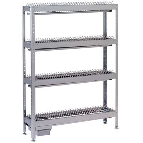 Вместимость тарелок 88 шт. Максимальная нагрузка на полку 21 кг. Стеллаж выполнен из пищевой нержавеющей стали. Он содержит четыре полки-кассеты. Кассета представляет собой решётку из прутка, в ячейки которой помещаются тарелки. Каждая полка рассчитана на 22 тарелки. В поддоне предусмотрен небольшой уклон, обеспечивающий сток жидкости, поступающей с мокрой посуды к сливному отверстию. В нижней части стеллажа устанавливается ёмкость для сбора воды со всех полок-кассет.
