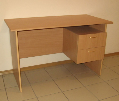 поставщик ЭМС - изготовлен из ЛДСП, торцы облицованы кромкой ПВХ 0,4 мм, столешница облицована кромкой ПВХ 2 мм. Стол имеет 2 ящика на роликовых направляющих и открытую нишу. На панелях ящиков установлены ручки-скобы металлические
