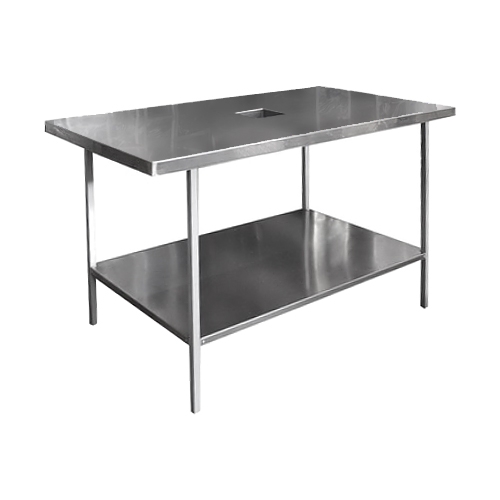 Стол для хлеборезки СРОх-1500 имеет сварную конструкцию. Каркас выполнен из профильной трубы 25х25, окрашенный порошковой краской. Столешница сделана из нержавеющей стали. Стол имеет квадратное отверстие с патрубком размером 160х160х120. Столешница снизу усиленна ЛДСП.