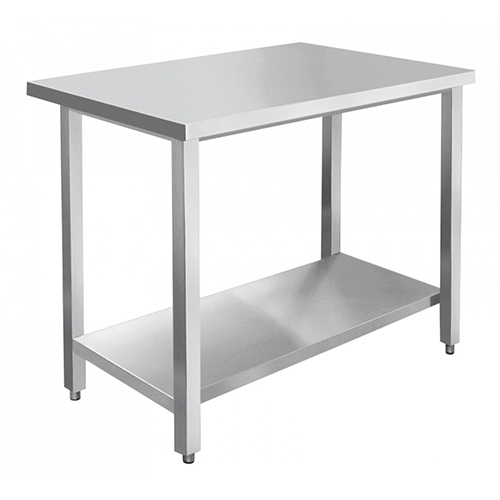 Допускаемая нагрузка на столешницу - не более 100 кг, на нижнюю полку - не более 50 кг. Столешница выполнена из нержавеющей стали с подкладкой из влагонепроницаемой фанеры толщиной 12мм. Усиленный стальной каркас и его стяжки изготовлены из квадратной трубы. Модель оснащена регулируемыми по высоте ножками.