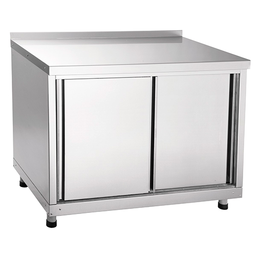 Допустимая нагрузка на столешницу (не более): 100 кг. Допустимая нагрузка на полку (не более): 30 кг. Стол оснащен двумя дверцами-купе и сплошной полкой, регулируемой по высоте. Проем открытой дверки: 430 мм. Все детали изготовлены из нержавеющей стали. Регулируемые по высоте ножки.