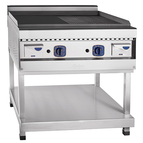Жарочная поверхность 834х703 мм имеет одну половину с гладкой поверхностью, другую с рифленой. Диапазон регулирования температуры жарочной поверхности100-350°С. Количество горелок - 2 шт. На лицевой панели расположены лотки для сбора масла. В комплекте съемная форсунка под сжиженный газ. Пьезорозжиг.