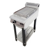 1 специальная горелка по всей площади рабочей поверхности с плавной регулировкой, газовая мощность 11.5 kW, чугунная рабочая поверхность, полностью рифленая поверхность, электророзжиг, газ/контроль, поддон для сбора жира, бортик по всему периметру жарочной поверхности. Стенд полностью разборный из нержавеющей стали c 1 полкой. г.нетто 420x800x1050, 75кг, г.брутто:510х950х650мм, 100кг
