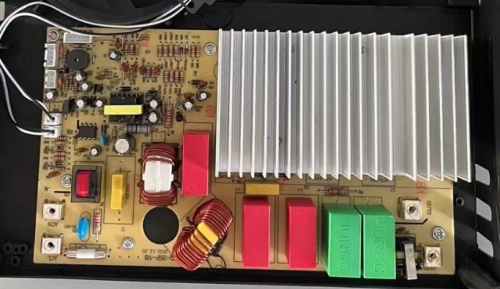 Плата силовая плиты индукционной - аппаратура электрическая на напряжение 220 В, оборудованная двумя или более электрическими и электронными компонентами (конденсаторы, резисторы, контактные элементы, микросхема, силовые транзисторы), не имеющая программируемую память, предназначенная для управления мощностью электромагнитного поля, генерируемого катушкой для нагрева пищи, принимает сигналы управления с платы пульта управления индукционной плиты.